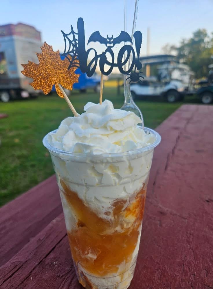 Vanilla ice cream covered in apple topping, caramel & nutmeg, topped with whip cream